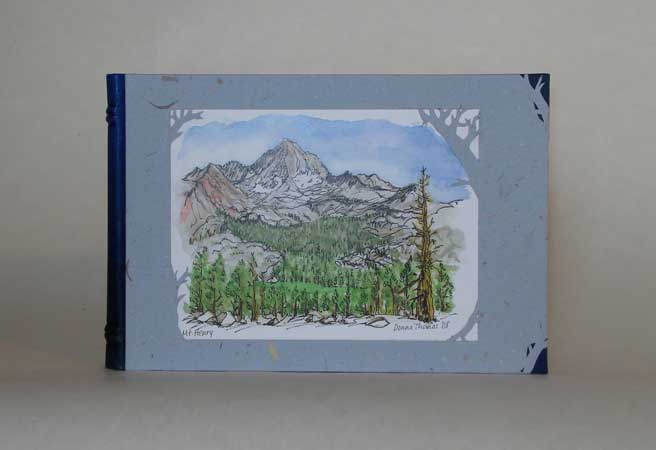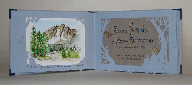 The text is a poem by Anne Stevenson, a contemporary poet who has allowed Donna to use her beautiful poem in this artists’ book. The book is hand written on Peter's handmade paper by Donna using her personal calligraphic face, in black ink with rubricated inital letters and opening words in blue and gold inks. There are six landscape watercolor paintings and four watercolor illustrations of wildflowers. Donna carries paints and paper with her when backpacking, and these paintings were all made on trips in the Sierra in 2011. The illustrations are held in place and framed by silhouette cut outs of trees, rocks and flowers. The book is 3/4 bound in with blue goat and Peter's hand made paper, with a watercolor framed by silhouette cut outs on the front cover. The end pages are paper made with sedge and blackberry fibers harvested from our gardens. The book is housed in a clamshell box covered in silver-blue silk book cloth with the title and silhouette tree imagery on the front cover. Handmade paper made by Peter Thomas. $850.