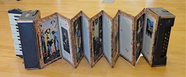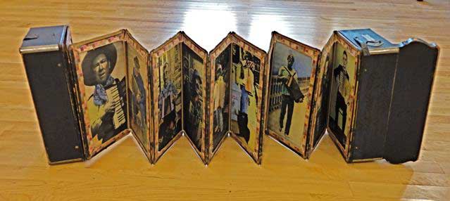 This book is made by opening the bellows of a no longer functional vnitage accordion to create an accordion book structure. The text, a story by Mark Twain, has been printed and hand rubricated by Donna Thomas on Peter's handmade paper. The images are of accordion players that have been printed on Peter's handmade paper and hand colored by Donna Thomas. This is a unique book, similar, but different to the Real Accordion Book we made in 2001. The accordion is housed in a vintage black chipboard accordion case. $1650