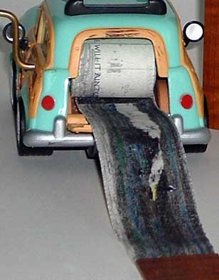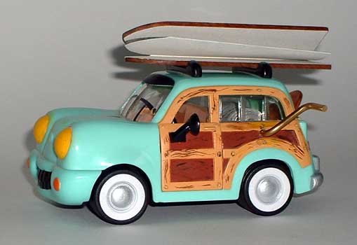 The lyrics to Jan and Dean's Surf City (I got a '34 wagon and we call it a woidie...) are printed on a scroll that also has a hand painted photo collage of surf and woodie images. The scroll is mounted inside the model car, on a brass crank mechanism. Peter and Donna Thomas: Santa Cruz: 2003