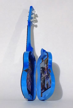 Ukulele Series Book #24 The Photo Album Uke. 2014. The ukulele was sawed in half, braced with rosewood strips and hinged at the spine. Photographs were mounted on black matt board and glued to the braces.