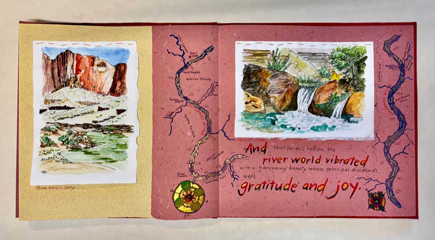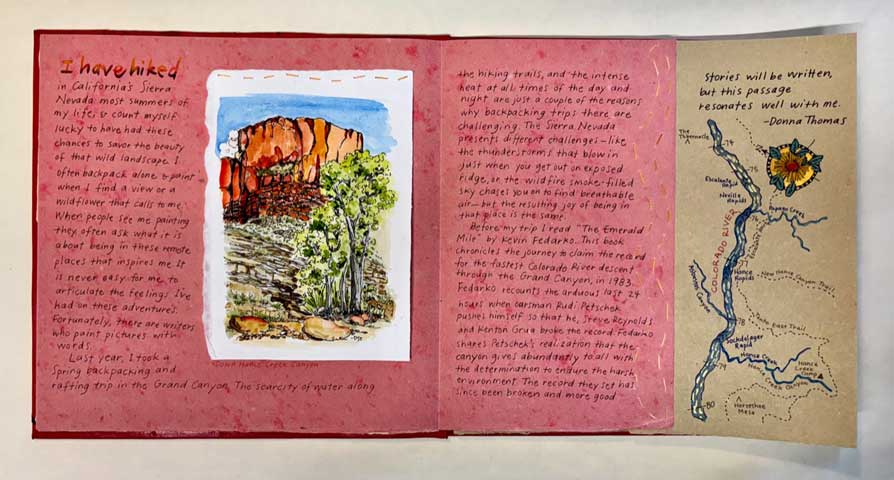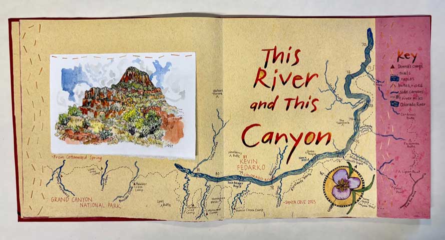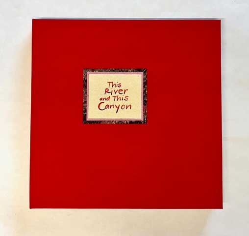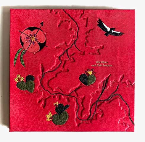 This River and This Canyon. 2025. Kevin Fedarko and Donna Thomas. Santa Cruz. 12.5 x 12.75 inches. 12 accordion pages. Price $2800. Binding: Full bound red Morocco leather. Cover: bas relief of Grand Canyon; cacti, condor, and flowers leather onlays; title in gold. Inside cover paper, handmade by Peter Thomas. Text paper: yellow, ochre, red paper handmade by Peter Thomas. Text is hand lettered. Notes: The paintings illustrating this book were made on a 2024 hiking and rafting trip in the Grand Canyon. Before the trip Donna read “The Emerald Mile” by Fedarko. As she hiked to the river, and especially when rafting, she recalled stories from the book telling of the intrepid river runners who set a speed record for rafting down the Colorado River in the 1980s. Those stories and especially the insight shared in the chosen quote resonated with Donna, also an intrepid hiker in the Grand Canyon and other wild places, and inspired her to create this book.