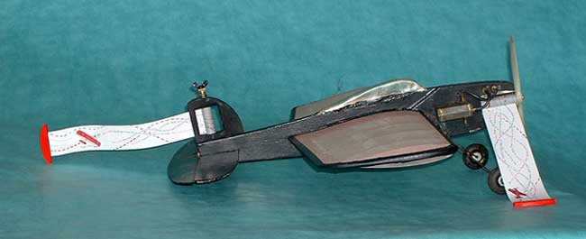 This 1960's gas powered U-control model airplane has been modified and rebuilt by Peter and Donna Thomas. The texts, outlining the history and dangers of flight, were written and illustrated by Donna Thomas. These texts, reminiscent of sky-borne advertisements and time lines, have been bound as scrolls to the propeller and to the tail of the plane. The wings and texts are made using Peter's handmade papers. A colophon attached to the sparkplug resides, as a prayer, inside the bored out cylinder of the motor. Peter and Donna Thomas: Santa Cruz: 2003