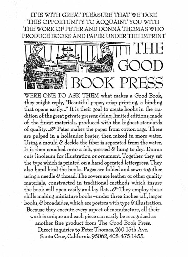 It is with great pleasure that we take this opportunity to acquaint you with the work of Peter and Donna Thomas who produce books and paper under the imprint of The Good Book Press. Were one to ask them what makes a Good Book, they might reply, “Beautiful paper, crisp printing, a binding that opens easily..." It is their goal to create books in the tradition Of the great private presses: deluxe, limited editions, made of the finest materials, produced with the highest standards of quality. Peter makes the paper from cotton rags. These are pulped in a hollander beater, then mixed in more water. Using a mould and deckle the fibers are separated from the water. It is then couched onto a felt, pressed & hung to dry. Donna cuts linoleum for iillustration or ornament. Together they set the type which is printed on a hand operated letterpress. They also hand bind the books. Pages are folded and sewn together using a needle & thread. The covers are leather or other quality materials, constructed in traditional methods which insure the book will open easily and lay flat. They employ these skills making miniature books (under three inches tall) ,larger books & broadside (which are posters with type & illustration. Because they execute every aspect of manufacture, all their work is unique and each piece can easily be recognized as another fine product from The Good Book Press. |