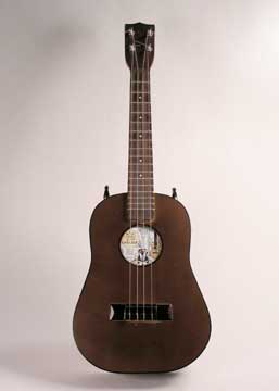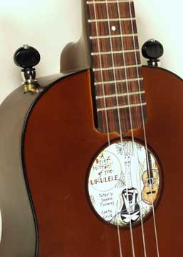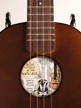 Ukulele Series Book #10 The Scrolling Ukulele. 2002 This is a tenor sized ukulele. The same tuners used for the strings were attached to brass tubing and mounted inside the ukulele, parallel on each side of the sound hole. Our book, "A Brief History of the Ukulele" was attached to the tubing and can be seen as it scrolls across the sound hole.