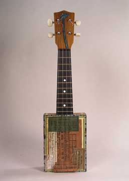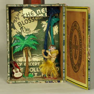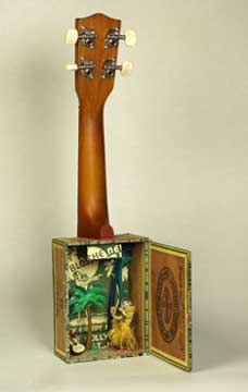 Ukulele Series Book #15 The Cabinet of Curiosities - Cigar Box Ukulele. 2002 A small sized cigar box was attached to a soprano ukulele neck. Inside the cigar box is a diorama which tells a story about the historical allure of Hawaii as an archetype of tropical paradise. Artists often think of these structures as books because of the way they tell a story, and the story can be different for each viewer.