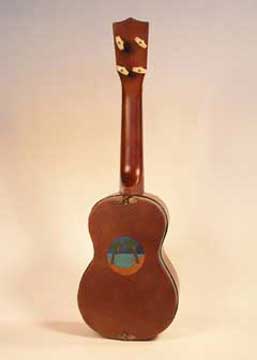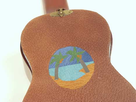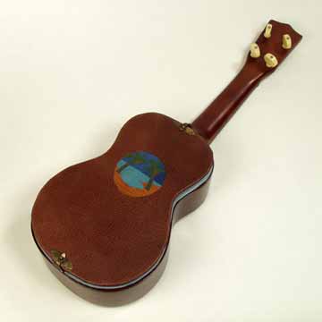 Text is Little Grass Shack, handwritten and illustrated ukulele shaped paper cut in paper doll style. Leather bound cover with leather onlay picture in sound hole.