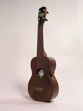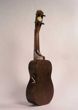 Ukulele Series Book #20 The Ukulele Flip Book. 2003 This Regal uke has been converted into a flip book showing a mainlander's dream of paradise. The animated hula dancer was created by Evert Brown. The pages are attached to a dowel with a brass crank handle. This is inserted through a hole in the side of the ukulele and the pictures are viewed through the sound hole.