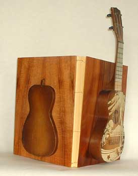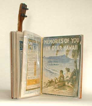 Ukulele Series Book #22 The Ukulele Sheet Music Book. 2002 The ukulele was sawed in half and attached to koa wood boards. Vintage sheet music is bound between the two halves.A special case was constructed to house the book.