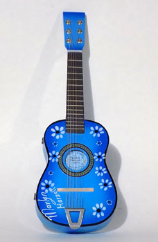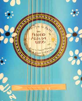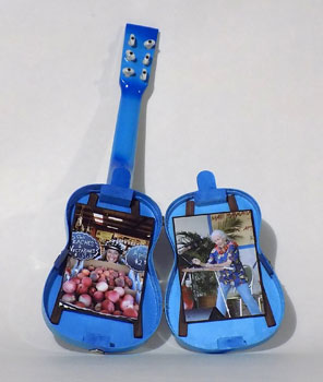 Ukulele Series Book #24 The Photo Album Uke. 2014. The ukulele was sawed in half, braced with rosewood strips and hinged at the spine. Photographs were mounted on black matt board and glued to the braces.