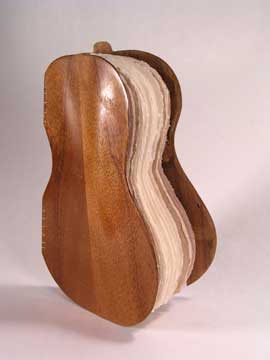 Study for a coptic binding with old top and back of a ukulele. 2001 Double ukulele shaped paper is folded in half and coptic stitched into covers from an old concert sized Kamaka ukulele.