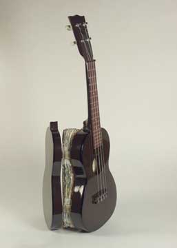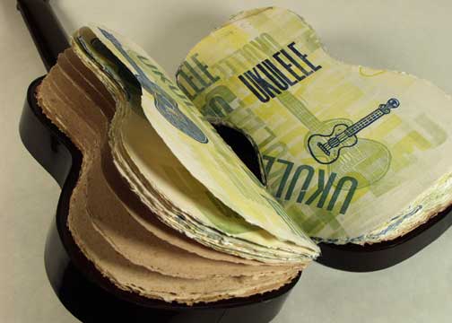 This is a rejected prototype concert ukulele donated to the ukulele book cause by Lehua Ukuleles. It was sawed in half and boards were added to make both halves solid. Pages were handmade with a double ukulele shaped deckle so that the pages could be folded and sewn through the spine. The pages were then letterpress printed in various colors of ink, using old wood type and two of Donna's linocuts of ukuleles. The book was sewn with two needles over tapes. The tapes, made of brass wrapped in leather, were attached to the front and back half of the ukulele with brass hinges and screws.