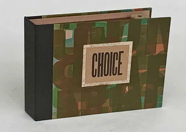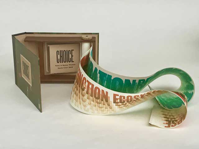 Choice. Peter and Donna Thomas, William Shakespeare. Santa Cruz, California, Peter and Donna Thomas (2024). 5.25 x 7.25 x 1.5 inches. 2 scrolling pages (4 x 21.5 inches) with tri-fold pamphlet. 10 copies. This book is about the consequences of choices that are being made around us. When asked to choose war or peace, when required to make a decision pitting profit against the health of the planet, when faced with the question “To be or not to be?” which option will we choose? Binding: Scroll; quarter bound, black Moroccan leather spine, Peter’s handmade paper over boards, brown, letterpress printed with wood type in brown and greens. Title on label on cover. Inside cover paper, Peter’s handmade in brown. Text block: Scroll wound over wooden dowel that passes through holes drilled in a wooden framework that is attached to the back cover of the binding. Wooden knobs affixed to dowel to assist in turning scroll. Paper: White, handmade by Peter. Printing: Letterpress. Typography: Various wood type fonts, over printed, split fountain, ATF Futura Bold. Notes: A tri-fold pamphlet printed with the title and text is affixed under the scroll, inside of the back cover, hidden by the scroll. Both scroll and pamphlet have wood strips glued to them to protect, and assist holding the paper. Notes: A close inspection of the book reveals the skills, tools and material sourcing need to create it: making the paper strong enough to withstand use as a scroll, letterpress printing long strips of paper with multiple runs, sawing wood to create the small pieces required to make the scoll's framework and the protective strips, creating the knobs, sourcing small screws to affix them to the dowels, gluing and clamping the framework, sanding and finishing the wood, case binding with leather and paper to name a few. An artists' statement follows the photographs: