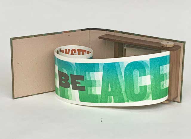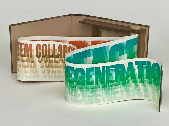 This book was made to submit to the10th International “Artist's Book Triennial Vilnius” competition in Lithuania (December 2023). The challenge was to create a book based on the theme “TO BE”. I thought a long time about what book I might create in response to this theme. But did not come up with any unique ideas, until I was talking with a friend who shared a story about his friend committing suicide, and I thought about making that choice, and I thought about how the world is making that same choice by not addressing climate change and I had the beginnings of an idea for the book. To be, or not to be, that is the question. I decided to make it a scrolling book, because they are complex structures, difficult to make and difficult for the viewer to work with, just as addressing the issues involved in climate change and species extinction are incredibly complex and difficult. I use the two sides of the scroll to juxtapose the positive and the negative: finding hope for the future or having no hope for the future. Just as in Pandora’s box, the little bit of hope to be found is the last bit of text the viewer will find, under everything else, hidden at the very bottom of the structure. To make this book we had to employ all of the skills we have gained in our over 40 years of making books. The wood we used was all sustainably grown and harvested hardwoods, the paper was made from recycled rags, and the type in our shop has been reused for years and years; a series of sustainable choices. I made a paper strong enough to use as a scroll and for the cover of the book, we printed using both metal and wood type with multiple layers of color, and employed our woodworking skills to cut the many tiny pieces required to build the framework and hold the scroll. The story of making this book has a twist ending. We printed 11 sets of scrolling pages in November of 2023, bound one book and sent it off to Lithuania. It was held up, processing through the Lithuanian post until after the competition deadline, and then returned to sender before the organizers could pick it up. On its way back to Santa Cruz it was again held up, looping between post offices, finally arriving in Santa Cruz three months after being first mailed. So, in fact, it was never even submitted to the exhibition we made it for. But we are still grateful, as without the impetus of that show we never would have made it, and now complete, we find it fills a very important place in our recent body of work about hope for the future. So thank you Artists Books Vilnius for the inspiration!