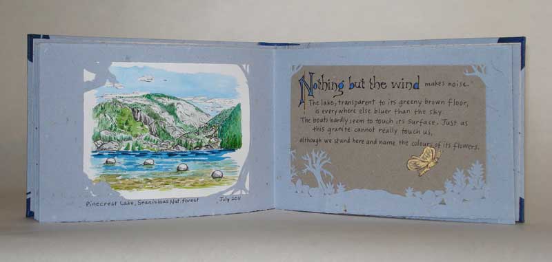 The text is a poem by Anne Stevenson, a contemporary poet who has allowed Donna to use her beautiful poem in this artists’ book. The book is hand written on Peter's handmade paper by Donna using her personal calligraphic face, in black ink with rubricated inital letters and opening words in blue and gold inks. There are six landscape watercolor paintings and four watercolor illustrations of wildflowers. Donna carries paints and paper with her when backpacking, and these paintings were all made on trips in the Sierra in 2011. The illustrations are held in place and framed by silhouette cut outs of trees, rocks and flowers. The book is 3/4 bound in with blue goat and Peter's hand made paper, with a watercolor framed by silhouette cut outs on the front cover. The end pages are paper made with sedge and blackberry fibers harvested from our gardens. The book is housed in a clamshell box covered in silver-blue silk book cloth with the title and silhouette tree imagery on the front cover. Handmade paper made by Peter Thomas. $850.