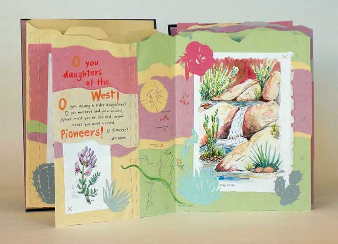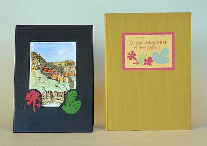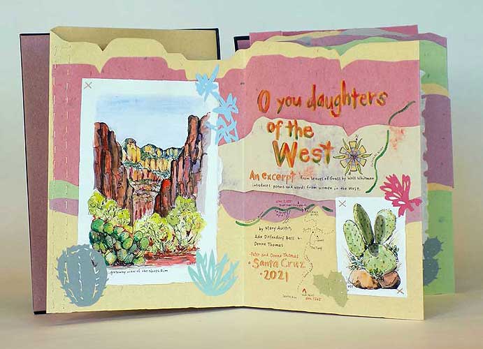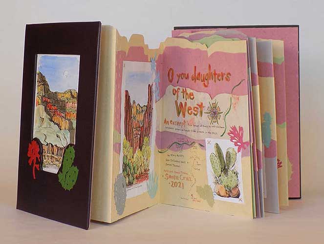 O You Daughters of the West! (2021) Texts by Donna Thomas, Mary Hunter Austin, Ada Diefendorf Bass, Walt Whitman. 16 accordion pages. 12.5 x 9 inches. $2,800 Accordion binding, front and back covers dark brown goat leather, watercolor painting inset in cut-out window and 2 leather onlays on front cover. Accordion made using multiple colored sheets of paper (handmade by Peter Thomas) cut and sewn together to resemble the rock layers of the Grand Canyon, stitched together with colored thread before folding. Text, maps and compass rose are hand painted on accordion. There are 8 watercolors, painted plein air in the Grand Canyon, stitched to the accordion, and 16 cut paper illustrations glued to the accordion. Clamshell box, Gold cloth covers, yellow Oasis leather spine, ocher handmade paper sides, handmade paper interior, paper label with title and paper cut plants on front cover Artists' notes: This book was made after a week-long backpacking trip in the Grand Canyon. It was the beauty of the canyon that shaped the poem I wrote, and inspired the layout and structure of this book. In it, I have paired paintings I made while on a multi-day backpacking trip in the canyon with quotes that illustrate a few ways nature, when we are immersed in it, shapes our lives and experiences. The text paper is cut and folded to recreate the geologic layers of the canyon, and the quotes the layers of challenge that nature presents in the harsh conditions in the canyon. I begin the text in the book with a quote from Walt Whitman, a short segment from his “Song of Myself,” where he acknowledges the strength of women united, and honors women’s’ pioneering spirit. I then fill the rest of the pages with my own poem and quotes from the writing of Ada Bass and Mary Austin. Ada Diefendorf Bass and her husband William Bass ran one of the first tourist operations in the Grand Canyon starting in the 1880s. She wrote in her diary of the struggles she faced every day trying to find wood and water, trying to stay warm and feed her family. The bitter environment shaped her life in the canyon, and it wasn’t until the end of her life that she expressed her love for the beauty of the place. Mary Hunter Austin attributes this poem to an Ojibwe song. This tribe was forced from their homeland in the Great Lakes area to Kansas and then further into the “strange land” of the Southwest. Even with the sadness in the song, there is hope in knowing that nature heals by allowing us to ride home on the wind and thunder. When I was hiking in the canyon, painting these paintings, I felt a kinship with these women, even though the time I spent in the dry dusty desert was relatively easy compared to the hardship pioneer women like Ada faced, and mine was by choice. Hiking to Clear Creek Canyon may have been hard, but I didn’t just have to survive, and I could take time to immerse myself in the beauty of the land, because unlike Ada, I was only there for a short time, and had my comfortable backpacking tent, sleeping bag, and warm food to look forward to at the end of the day.