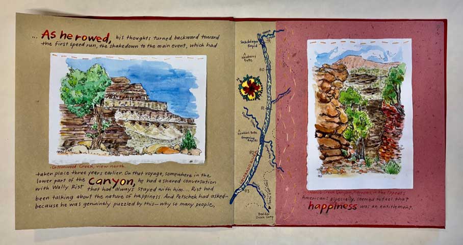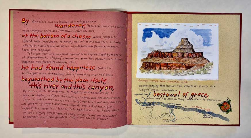 This River and This Canyon. 2025. Kevin Fedarko and Donna Thomas. Santa Cruz. 12.5 x 12.75 inches. 12 accordion pages. Price $2800. Binding: Full bound red Morocco leather. Cover: bas relief of Grand Canyon; cacti, condor, and flowers leather onlays; title in gold. Inside cover paper, handmade by Peter Thomas. Text paper: yellow, ochre, red paper handmade by Peter Thomas. Text is hand lettered. Notes: The paintings illustrating this book were made on a 2024 hiking and rafting trip in the Grand Canyon. Before the trip Donna read “The Emerald Mile” by Fedarko. As she hiked to the river, and especially when rafting, she recalled stories from the book telling of the intrepid river runners who set a speed record for rafting down the Colorado River in the 1980s. Those stories and especially the insight shared in the chosen quote resonated with Donna, also an intrepid hiker in the Grand Canyon and other wild places, and inspired her to create this book.