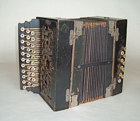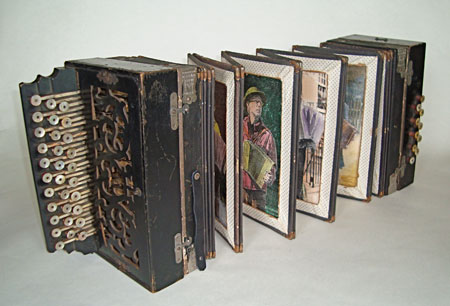 This book is made by opening the bellows of a no longer functional vnitage accordion to create an accordion book structure. The text, a history of the accordion and a history of the accordion book, has been hand calligraphed by Donna on Peter's handmade paper. The images are of accordion players that have been hand colored. This is a unique book, similar, but different to the Real Accordion Book we made in 2001. The accordion is housed in a wooden accordion case/box we made using pine boards painted to match the patina of the accordion. $1650