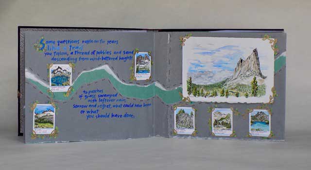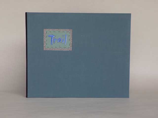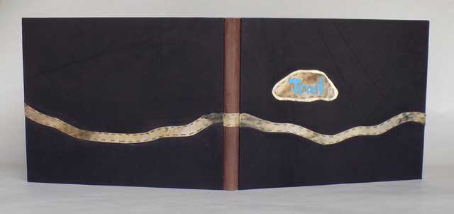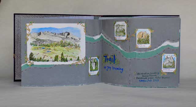 Jay Leeming. Trail. (Santa Cruz, California:) Peter and Donna Thomas, 2019. 11” x 13 ½” x ¾”. 12 accordion pages. Binding: Full leather black goatskin binding with brown goatskin spine, a “trail” of Donna’s vellum-tanned deerskin winds across both the front and back covers. Clamshell box: Blue cloth, black leather spine. Paper: Text paper accordion is Peter’s gray and white duplex paper that is torn through the middle of the paper reveals a trail running through the accordion folds. Typography and illustration: The text is brush-work calligraphy with watercolor and gouache. Five 5 ½” x 8 ½” landscape illustrations and twenty-two 2 ½ x 2 ½” illustrations (the paintings we copied to make our book, Landscapes of the John Muir Trail,) are affixed to accordion with paper-cut corners. Note: Jay Leeming is a Yosemite range and poet. The poem looks at the path through life as a trail, and “could it have been any different” if you had taken an alternate trail, and “you realize you will never get any other answer.”
